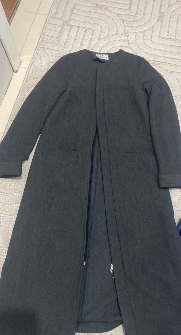 Kadın gri keten uzun kaban, kesik yaka ve fermuarlı kapama ile. Ofis için normcore tarzda, rahat kesim ve uzun kollu.