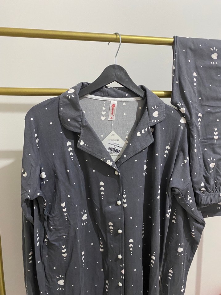 Kadınlar için bol kesim, uzun kollu ve baskılı desenli gri pijama takımı, rahatlık ve minimalist stil sunar.