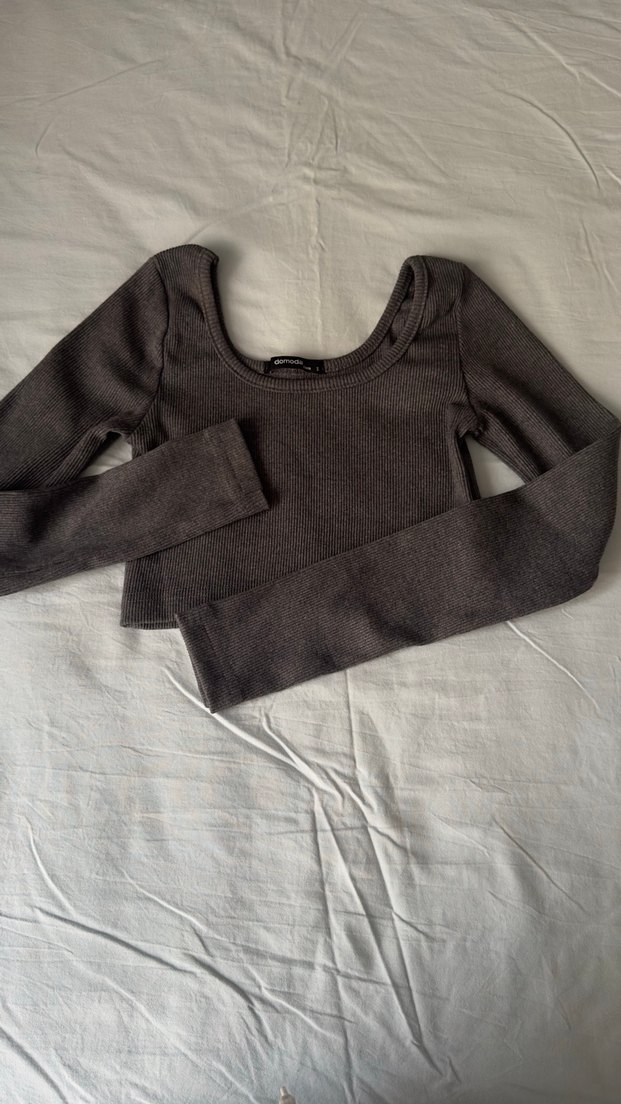 Kadınlar için uzun kollu, kayık yaka, fit kesim gri crop top. Yumuşak keten kumaştan, günlük kullanıma uygun sade tasarım.
