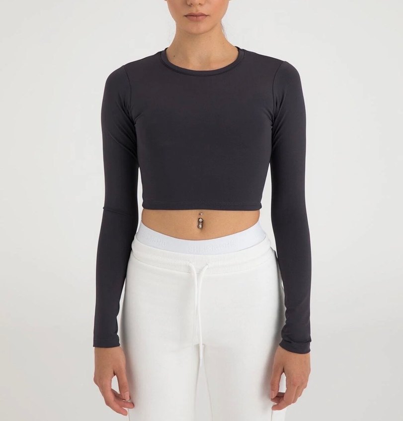 Pamuk kumaştan, füme renkte, uzun kollu ve yuvarlak yakalı, sade ve fitted kesimli kadın crop top. Günlük kullanıma uygundur.