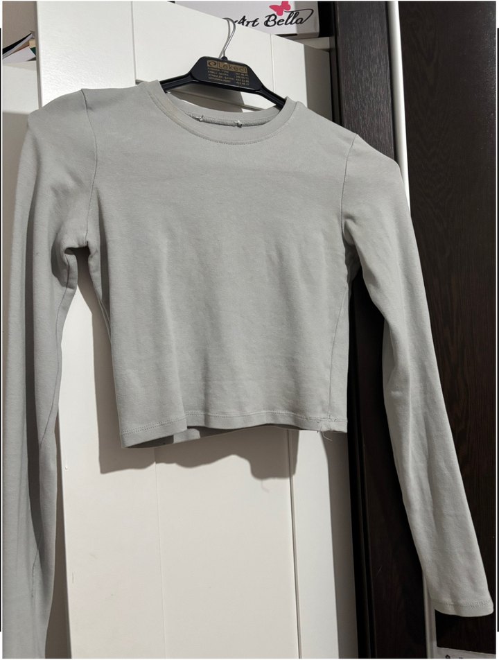 Pamuklu, gri renkte, uzun kollu ve yuvarlak yakalı kadın crop top. Günlük sokak stili için uygun, sade ve normal boyda.