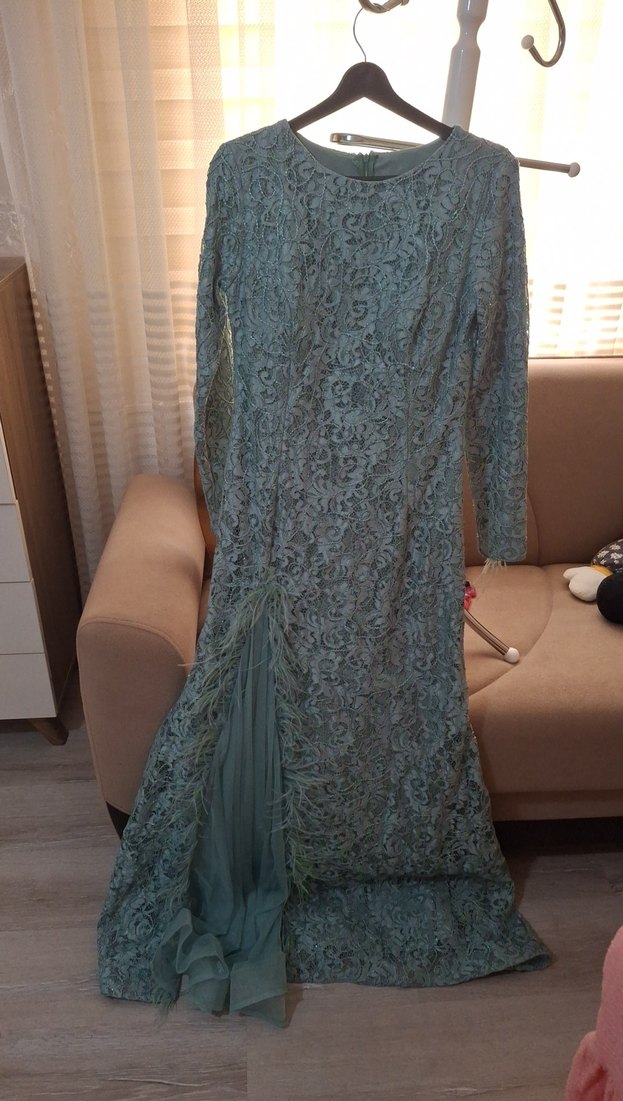Drapeli ve uzun kollu, gri renkte klasik vintage dantel detaylı, düğünlere uygun, vücuda oturan uzun abiye elbise.
