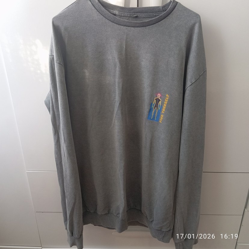 Gri renkli, uzun kollu, yuvarlak yaka ve bol kesim sweatshirt. Baskılı detaylı, yumuşak ve sıcak kumaştan günlük rahat stil için uygundur. Tarih detayı: 17/01/202.