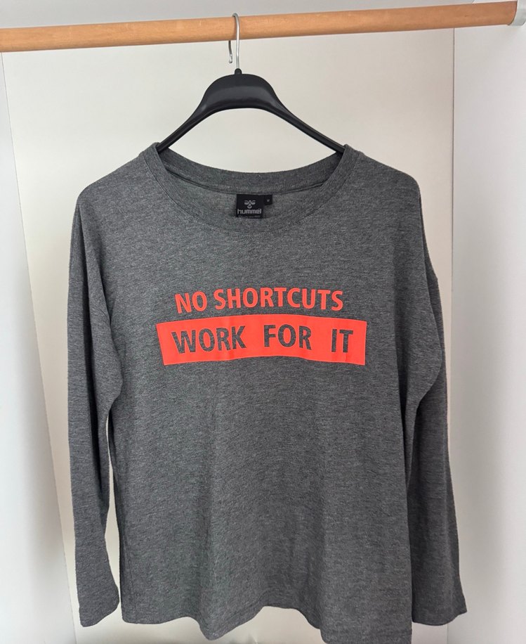 Gri renkli, uzun kollu ve yuvarlak yaka kadın sweatshirtü. Yumuşak yün kumaştan, kısa boy ve bol kesim. Kırmızı baskılı "NO SHORTCUTS, WORK FOR IT" mesajı bulunur. Spor ve sokak stili için uygun. ♀️
