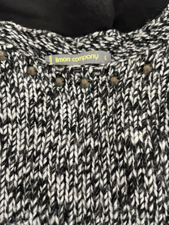 Limon Company kadın kazak, gri tonlarda yün örgüden yapılmıştır. Uzun kollu, uzun kesim ve salaş yapısıyla günlük kullanıma uygundur. Ön kısmında küçük düğme detayları vardır. Koltuk altı51cm/ ön uzunluk 60 cm/arka uzunluk 70cm , arka şifon düz siyah detaylı şık kazak