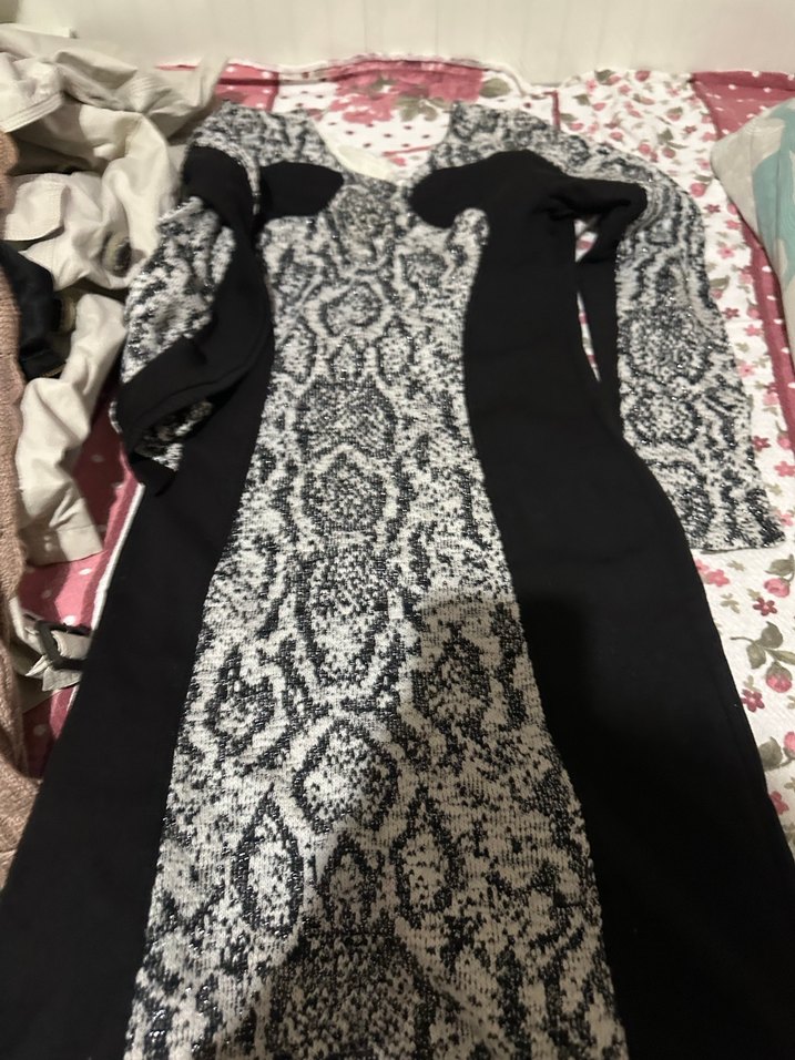 Kadın Gri Uzun Kollu V Yaka Desenli elbise