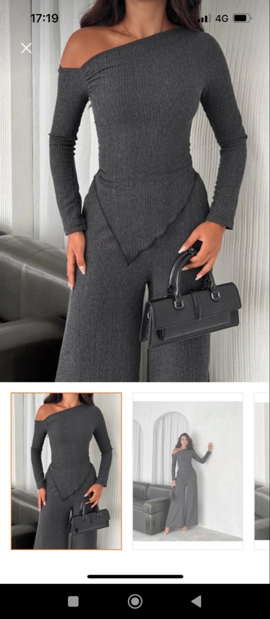 Kadınlar için gri, uzun kollu, V yakalı ve kemerli dar kesim tulum. Minimalist ve çağdaş tarzda, günlük kullanıma uygun.