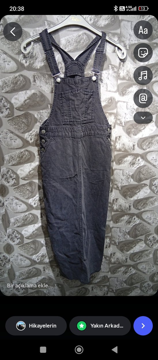 Gri, kolsuz, bol kesim kot t elbise kemerli ve bisiklet yaka detaylıdır. Günlük kullanıma uygundur.