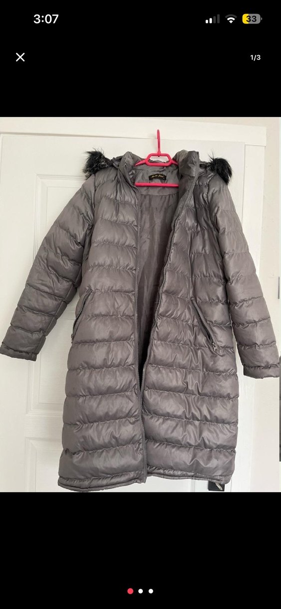 Kadınlar için uzun, gri renkli kışlık mont, kürk detaylı ve vücuda oturan kesime sahip. Etikette 44 yazıyor ama 40 42 uyumlu