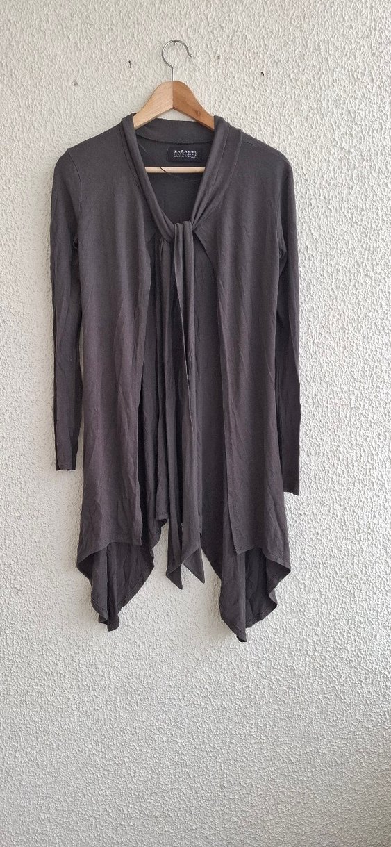 Kadın uzun kollu, V yakalı, gri renkli, salaş kesim ve uzun boyda drapeli hırka. Günlük kullanıma uygun, rahat goth tarzında. En uzun yeri yani kenarları 92 , ortası yani en kısa yeri 75.