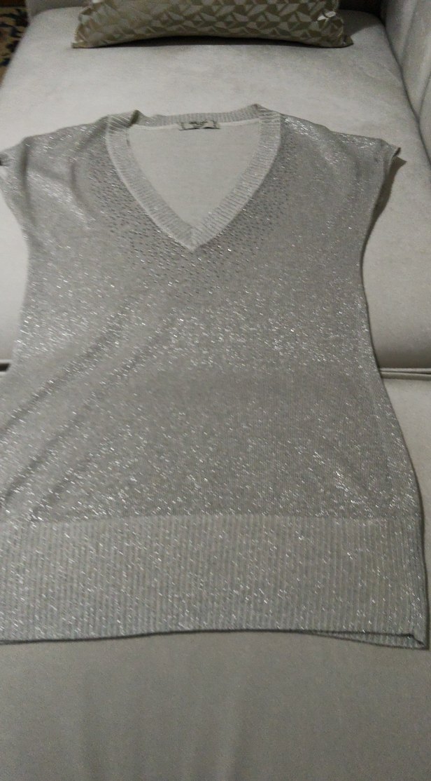 Gri renkli, V yaka ve kolsuz, örgü dokulu kadın süveter. Trendy ve rahat kesimiyle dış mekan kullanımına uygundur.