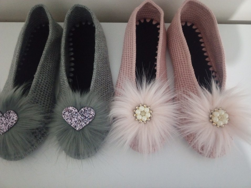 Gri ve pembe renklerde, triko malzemeden yapılmış kadın terlikleri. Dolgu topuklu, nakışlı ve kürklü detaylarıyla modern klasik tarzda, günlük kullanıma uygun.