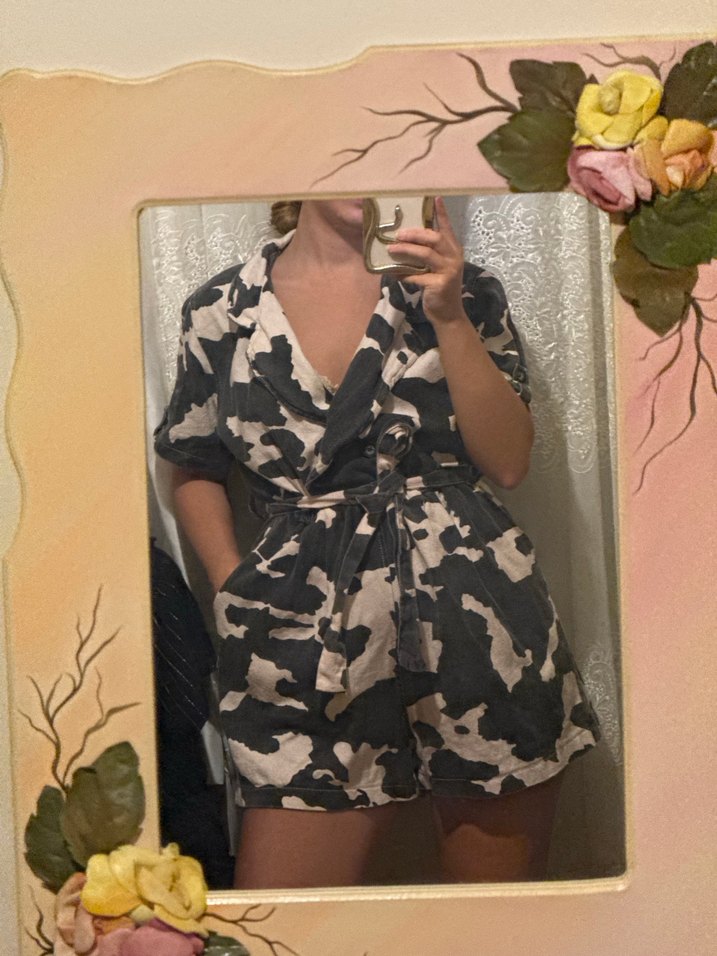 Kadınlar için gri kamuflaj desenli, V yakalı ve kısa kollu, bol kesim kısa tulum. Bel kemeri ve sentetik kumaştan üretilmiştir, günlük kullanım için uygundur.
