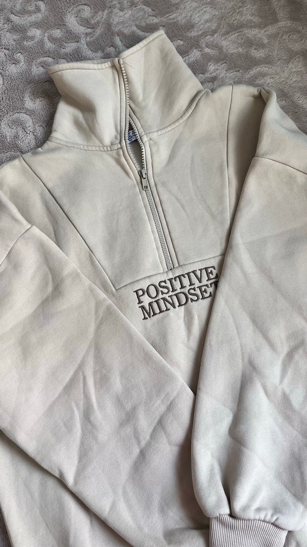 Yarım fermuarlı, yüksek yakalı ve uzun kollu bu kadın sweatshirtü, yumuşak kumaştan üretilmiş olup, önünde "POSITIVE MINDSET" baskısı bulunur. Rahat kesimiyle günlük sokak stiline uygundur.
