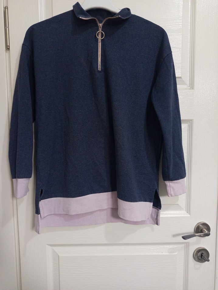 Kadın sweatshirt, yarım fermuarlı yüksek yakaya ve uzun kollara sahiptir. Bol kesim ve normal uzunlukta, yumuşak ve sıcak kumaştan üretilmiştir. Gri renkte, açık renk manşet ve etek ucu detaylıdır.