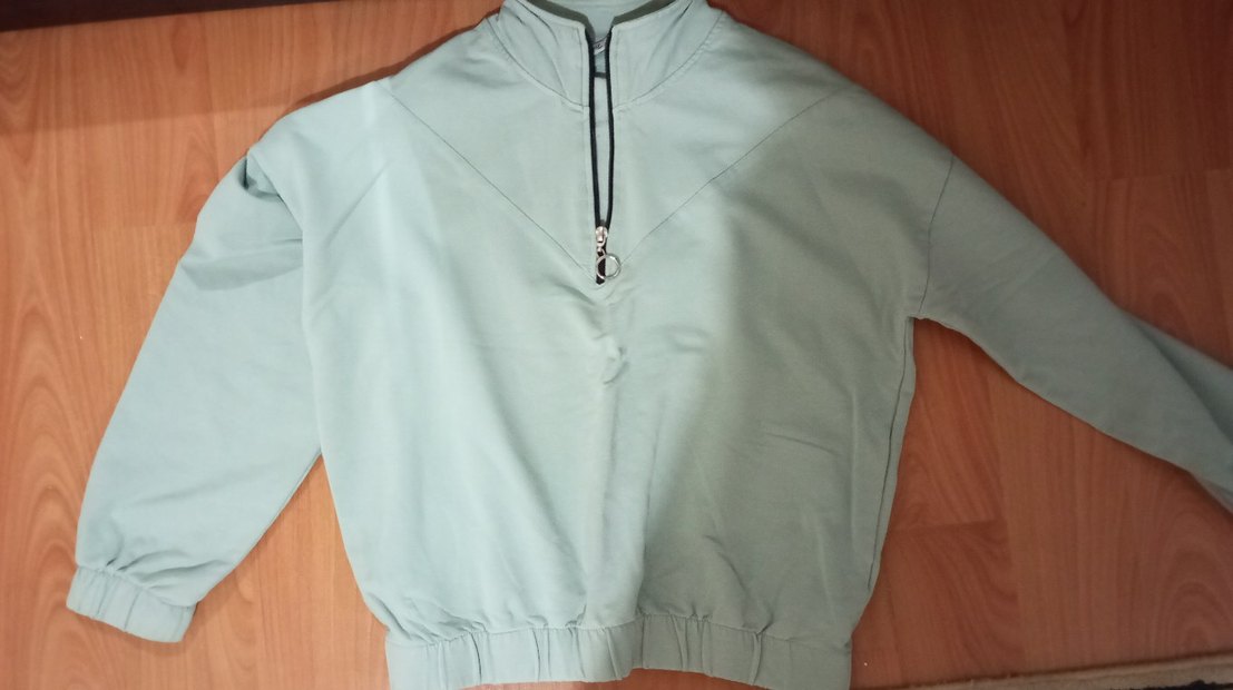 Kadın gri, yarım fermuarlı, kısa kollu sweatshirt. Sentetik kumaştan, bol kesim ve midi boyda, rahat ve günlük kullanıma uygun.
