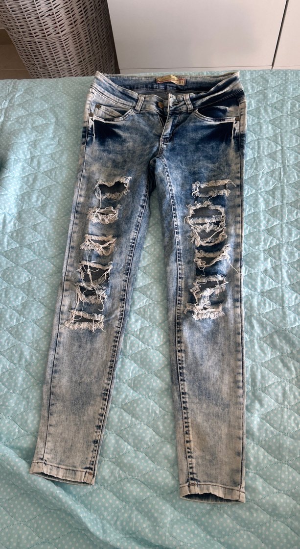 mavi yıkamalı dar kesim denim pantolon, yırtık detaylı, sokak stili ve günlük kullanım için uygundur. Uzunluk 87 cm