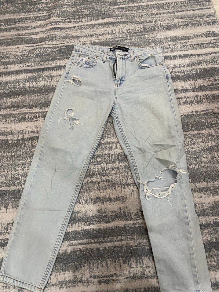 Kadınlar için tasarlanmış, rahat kesim, gri yıkamalı ve yırtık detaylı denim jean. Günlük kullanıma uygundur.