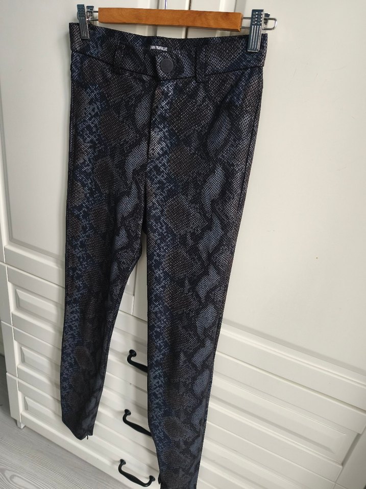 Kadınlar için yılan desenli, gri renkte, fitted kumaş pantolon. Midi boy, outdoor sokak stili için uygun.
