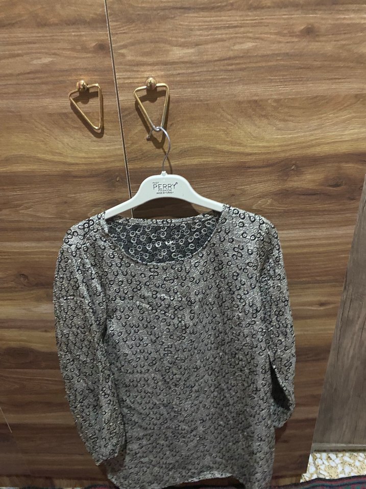 Gri yılan desenli, triko dokulu, keten kumaştan kadın bluz. Uzun kollu, kısa boylu ve rahat kesimlidir. Günlük sokak stili için uygundur.