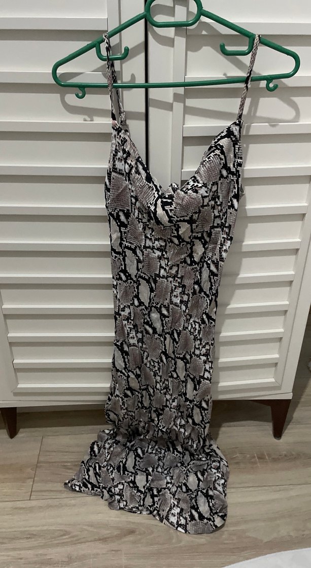 Kadınlar için gri yılan desenli, drapeli V yaka, kolsuz, uzun ve vücuda oturan elbisedir. Yumuşak sentetik kumaştan üretilmiştir, dış mekan sokak stiline uygundur.