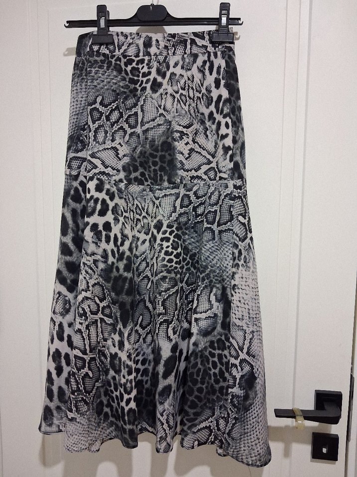 Sentetik kumaştan yapılmış, gri yılan desenli ve detaylı, vücuda oturan uzun etek. Bohem ve avangart tarzı yansıtır, açık hava etkinlikleri için uygun.