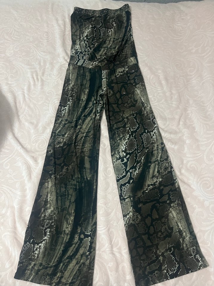 Koyu gri yılan desenli, yumuşak sentetik kumaştan yapılmış, straplez tulum
