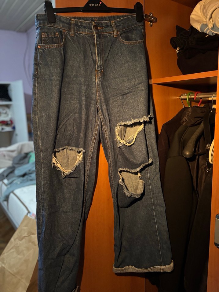 Kadınlar için bol kesim, yırtık detaylı ve midi uzunlukta gri denim pantolon. Günlük kullanıma uygun rahat bir sokak stili.