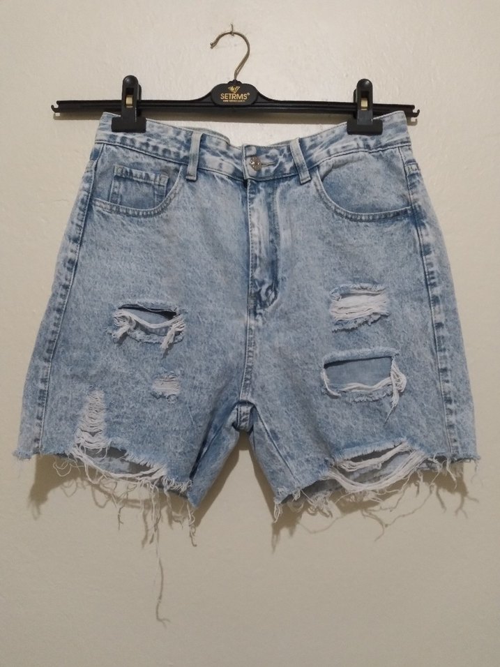 Gri tonlarında yırtık detaylı, bol kesim mini denim şort. Günlük kullanıma uygun, rahat ve şık bir sokak stili parçası.