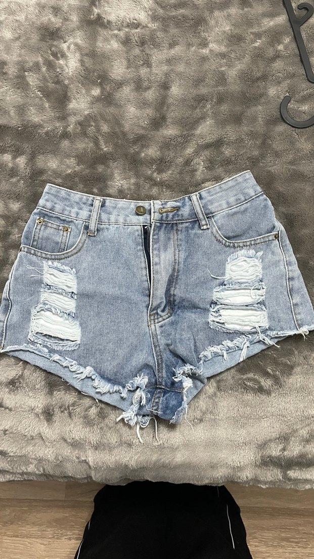 Gri renkli, bol kesim, yırtık detaylı ve püsküllü kenarlara sahip mini denim şort.