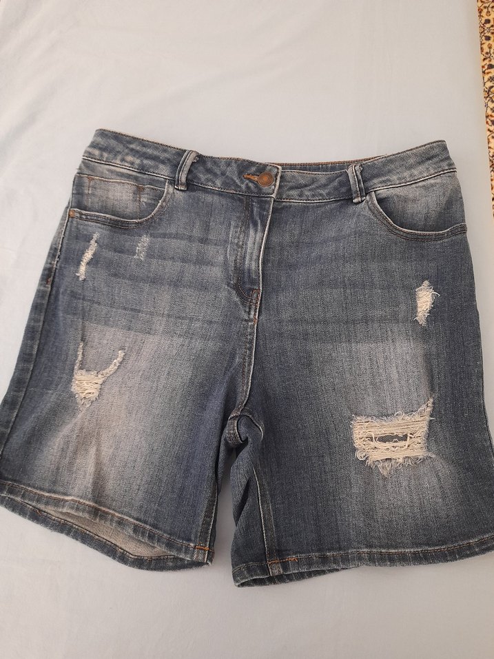 Gri renkli, bol kesim ve yırtık detaylara sahip kısa denim şort. Sokak stiline uygun, rahat ve şık bir dış mekan parçası. boy42cm bel çevresi 84cm basen çevresi 96cm esnek likrali kumaş