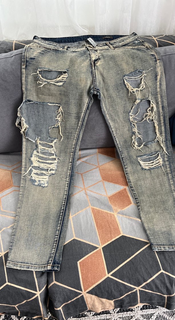 Yırtık detaylı ve tokalı, gri renkli, dar kesim jean pantolon, günlük sokak stili için uygun.