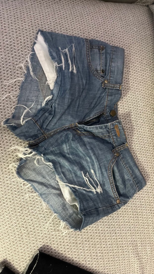 Kadınlar için bol kesim, yırtık detaylı ve tokalı mavi kot mini şort, günlük kullanıma uygun.