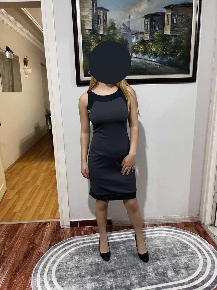 Kadınlar için yüksek yakalı, koloksuz, gri kalem elbise. Sentetik kumaştan, ofis ortamına uygun, zahmetsiz şıklık sunar.