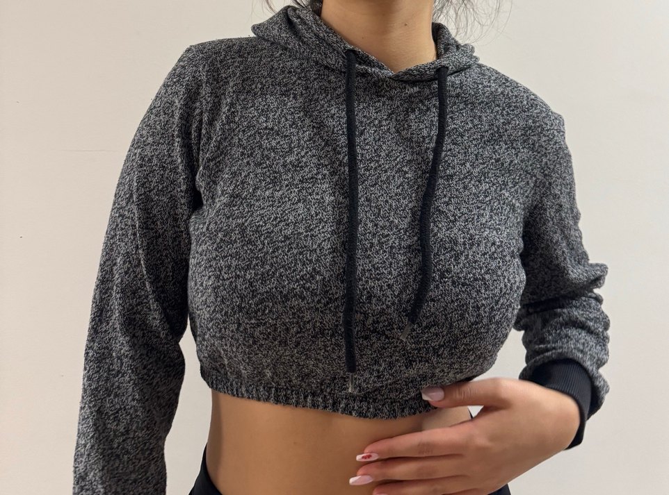 Kadınlar için gri renkte, yüksek yakalı ve uzun kollu, örme dokulu, vücuda oturan ve kısa kesim sweatshirt. Günlük rahat sokak stili için uygundur. ️