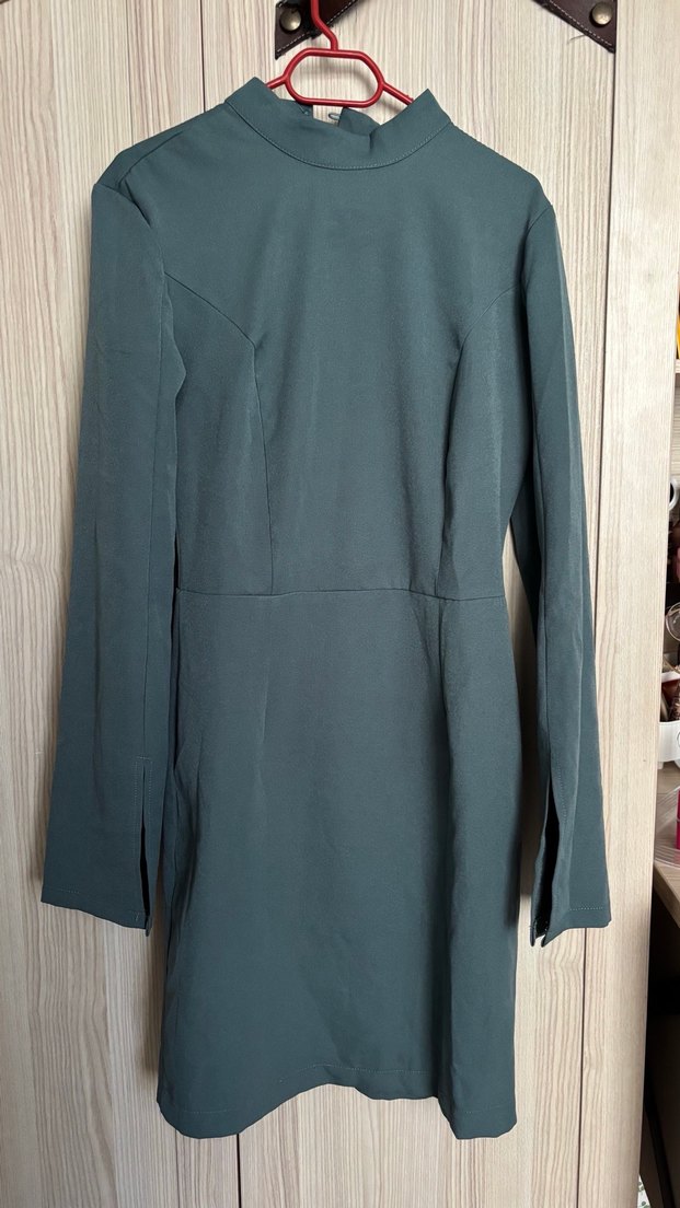 Gri renkte, yüksek yakalı ve uzun kollu kalem elbise. Sentetik kumaştan üretilmiş, drapeli ve regular kesim. Ofis için uygun.