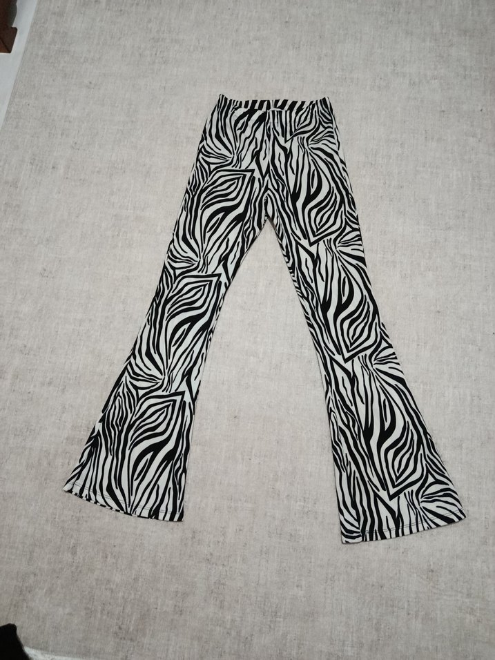 Gri zebra desenli, kürk detaylı, sentetik kumaştan yapılmış, oturan kesim flared pantolon. Rahat sokak stili için uygun.