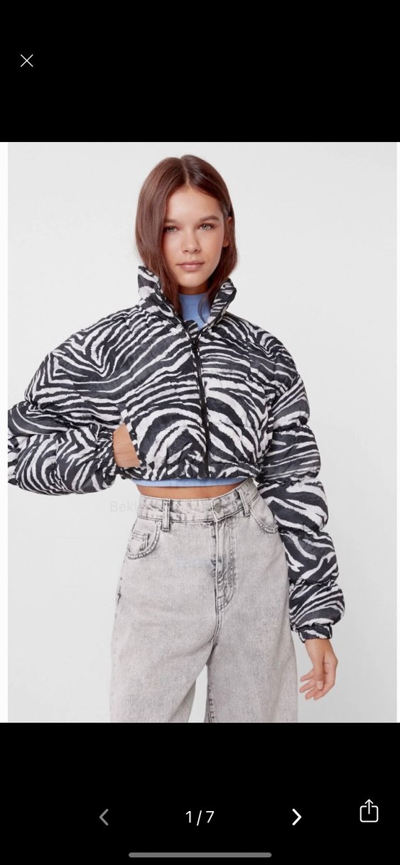 Kadınlar için gri zebra desenli kısa ceket, bol kesim, yüksek yaka ve uzun kolludur. Kürk detaylı denim kumaştan yapılmıştır, günlük kullanıma uygundur.