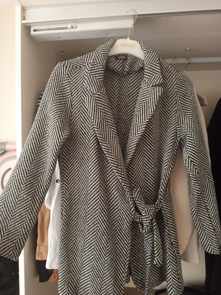 Kadın ceket, gri zebra desenli, kemerli ve normal boyda. Uzun kollu, regular fit ve sentetik kumaştan, ofis için uygun şehir tarzı.