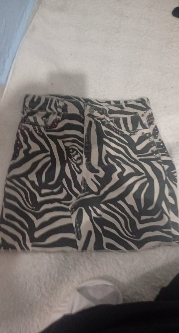 Kadınlar için gri zebra desenli, kürk detaylı, sentetik kumaştan yapılmış dar kesim mini etek. Avant-garde ve karşı kültür tarzlarına uygun, açık hava kullanımı için ideal.