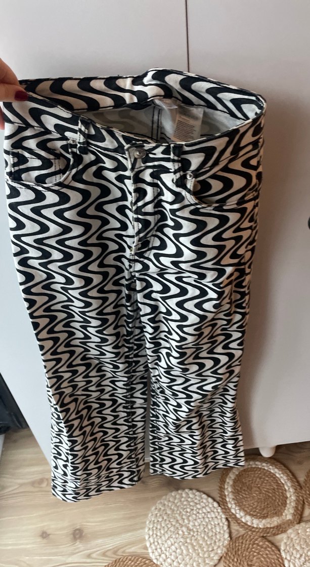 Kadınlar için gri zebra desenli, piliseli ve dar kesim uzun kumaş pantolon. Sentetik kumaştan üretilmiş, 'AVA' etiketi bulunur. Sokak stili için uygun.