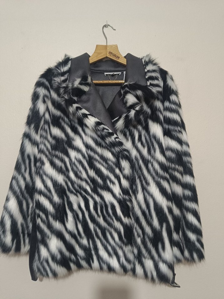 Kadınlar için gri zebra desenli, suni kürk detaylı midi uzunlukta, bol kesim ceket. Uzun kollu, yakası kesik ve sentetik kumaştan üretilmiştir, rahat ve şık bir sokak stili sunar. Hiç kullanılmadı. Sıfır ürün.