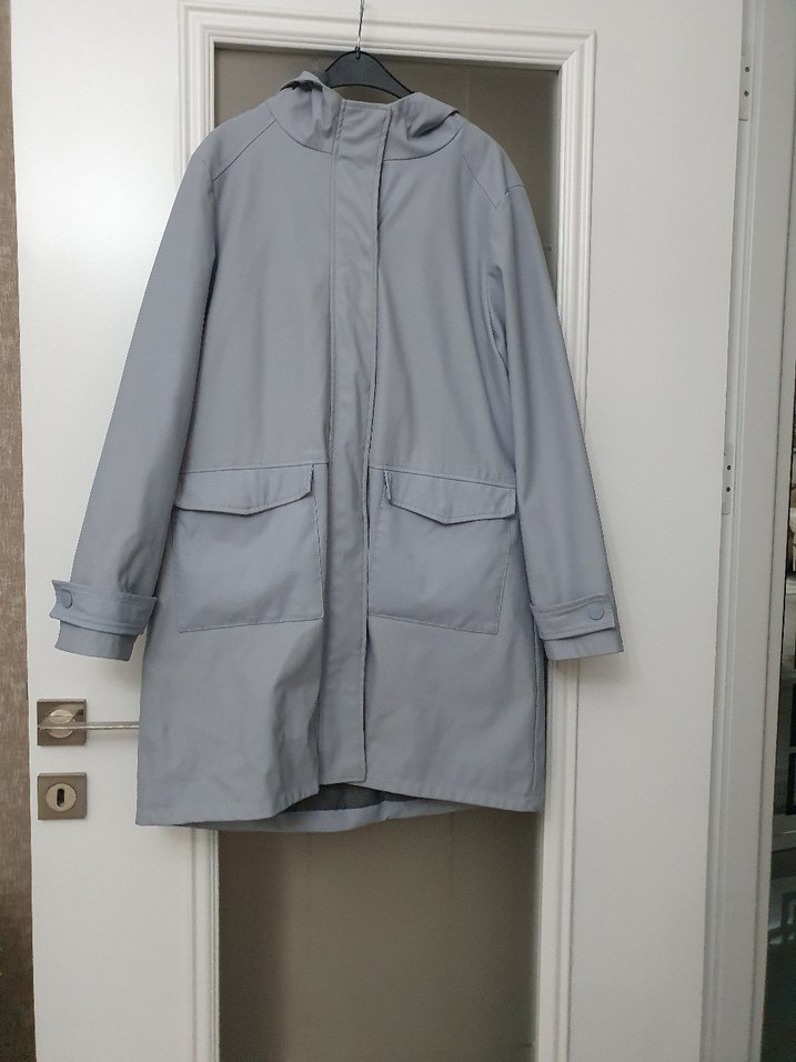 Kadın gri midi yağmurluk, düğmeli ön ve uzun kollu, bol kesim ve normal boyda. Sentetik kumaştan, minimal tarzda, yakalı ve kapaklı ceplidir. Günlük kullanım için uygundur. ☔Boy 85cm 2 koltuk arası 53cm