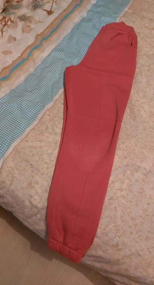 Kadınlar için normal boyda, cepli, pastel kırmızı renkte, yumuşak sentetik kumaştan yapılmış dar kesim eşofman altı. 98cm boyu vardır