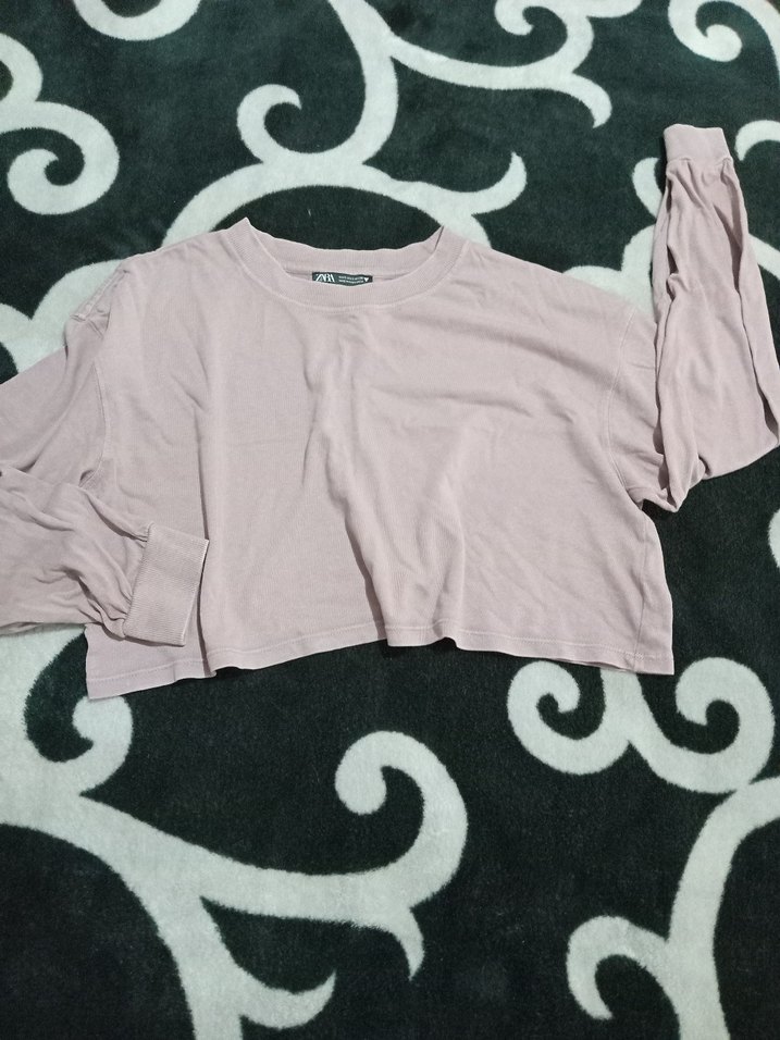 Gül kurusu renkli, uzun kollu, yuvarlak yaka ve bol kesim crop top. Yumuşak keten kumaştan, minimalist tasarım, günlük kullanım için uygun.