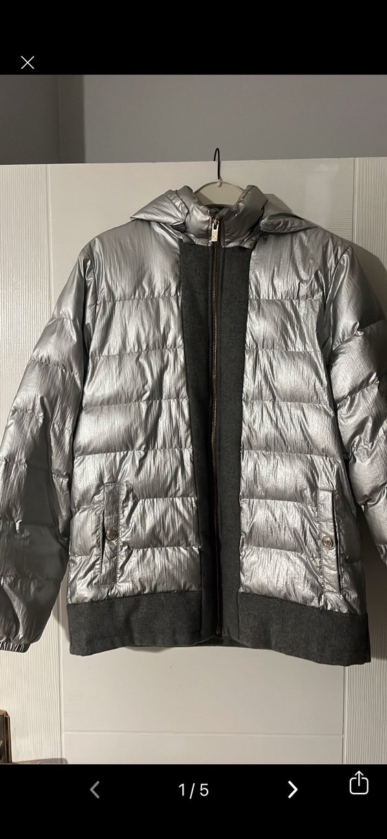 Fermuarlı, yüksek yakalı ve uzun kollu kadın mont. Metalik gri dış yüzeyiyle rahat ve midi boyda, sokak stiline uygun dış giyim ürünü.Bir sorunu yoktur.