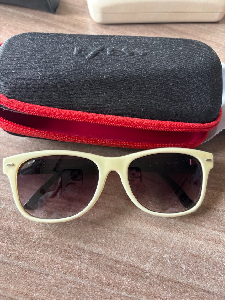 Parlak beyaz çerçeveli, klasik tasarımlı koyu renkli kadın güneş gözlüğü. Trendy casual sokak stiline uygun. Siyah-kırmızı koruyucu kutu ile birlikte.