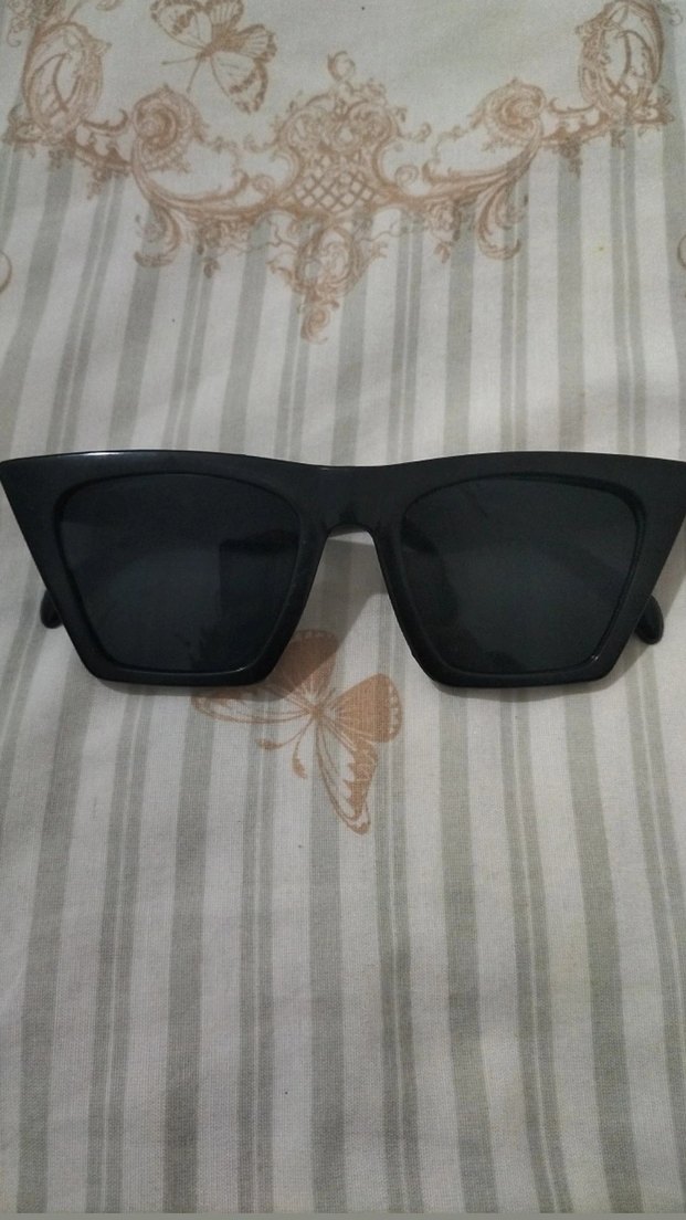 Siyah minimalist ve gotik tarzda kadın güneş gözlüğü, koyu renkte ve rahat şıklık sunar, rock punk havasına uygundur. Cat eye polarize. Hiç kullanılmadı.
