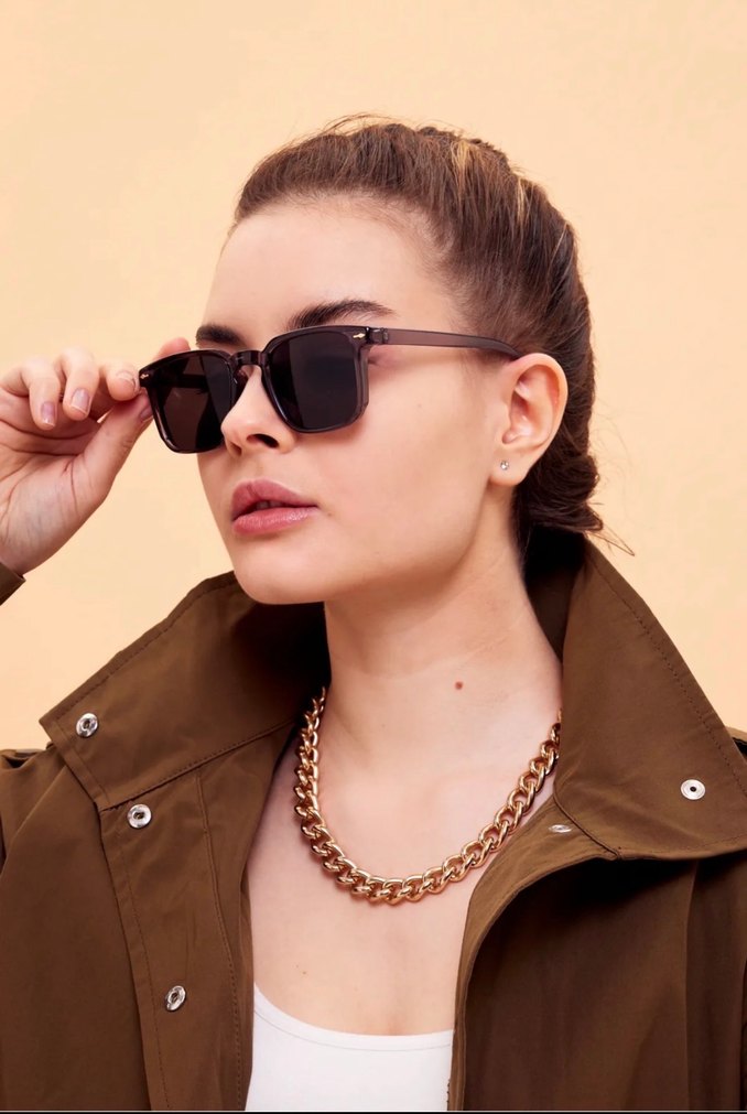 Klasik kare çerçeveli, parlak kadın güneş gözlüğü, zincir detaylı ve trend sokak stili ile uyumlu.