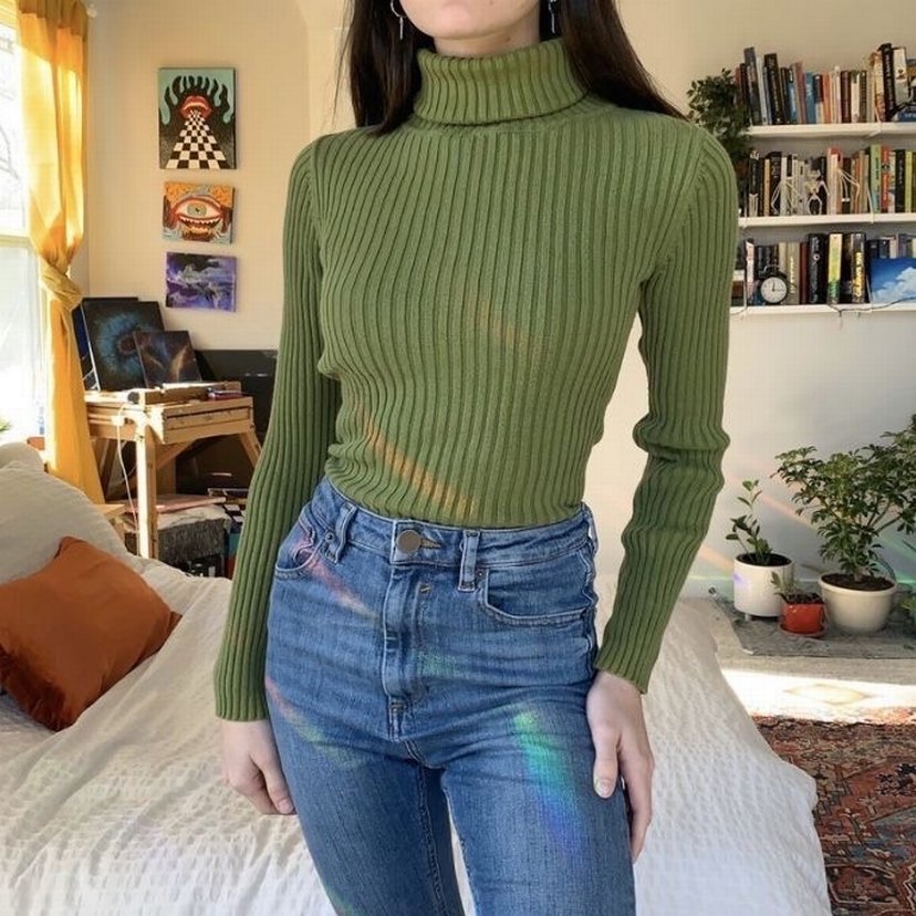 Fitted kesim, balıkçı yaka ve uzun kollu haki renk triko kazak. parlak yüzeye sahip, midi boyda, günlük sokak stiline uygun. Fitilli değiş böyle düz rengi tam haki koyu
